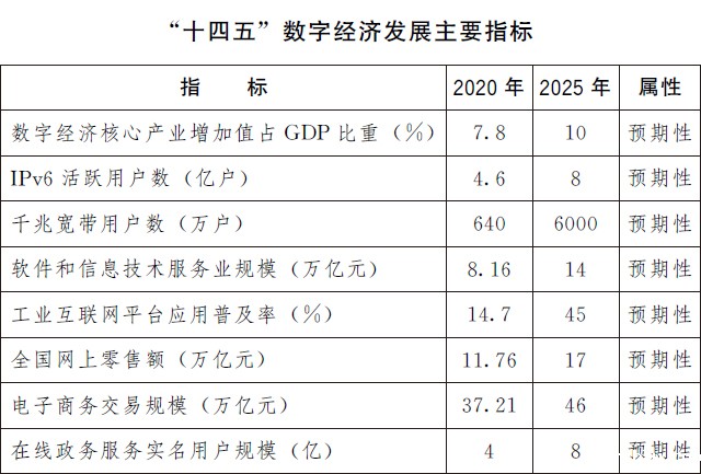 到2025年,数字经济迈向全面扩展期,数字经济核心产业增加值占GDP比重达到10%,数字化创新引领发展能力大幅提升,智能化水平明显增强,数字技术与实体经济融合取得显著成效,数字经济治理体系更加完善,我国数字经济竞争力和影响力稳步提升。