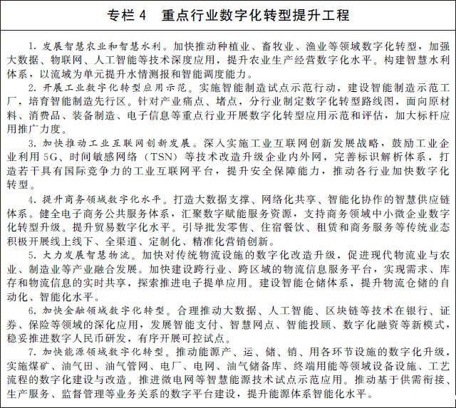 (二)全面深化重点产业数字化转型。立足不同产业特点和差异化需求,推动传统产业全方位、全链条数字化转型,提高全要素生产率。大力提升农业数字化水平,推进“三农”综合信息服务,创新发展智慧农业,提升农业生产、加工、销售、物流等各环节数字化水平。纵深推进工业数字化转型,加快推动研发设计、生产制造、经营管理、市场服务等全生命周期数字化转型,加快培育一批“专精特新”中小企业和制造业单项冠军企业。深入实施智能制造工程,大力推动装备数字化,开展智能制造试点示范专项行动,完善国家智能制造标准体系。培育推广个性化定制、网络化协同等新模式。大力发展数字商务,全面加快商贸、物流、金融等服务业数字化转型,优化管理体系和服务模式,提高服务业的品质与效益。促进数字技术在全过程工程咨询领域的深度应用,引领咨询服务和工程建设模式转型升级。加快推动智慧能源建设应用,促进能源生产、运输、消费等各环节智能化升级,推动能源行业低碳转型。加快推进国土空间基础信息平台建设应用。推动产业互联网融通应用,培育供应链金融、服务型制造等融通发展模式,以数字技术促进产业融合发展。