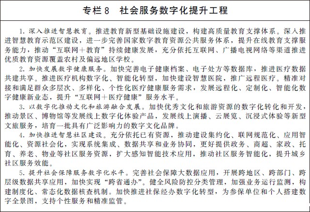 ——数字化公共服务更加普惠均等。数字基础设施广泛融入生产生活,对政务服务、公共服务、民生保障、社会治理的支撑作用进一步凸显。数字营商环境更加优化,电子政务服务水平进一步提升,网络化、数字化、智慧化的利企便民服务体系不断完善,数字鸿沟加速弥合。