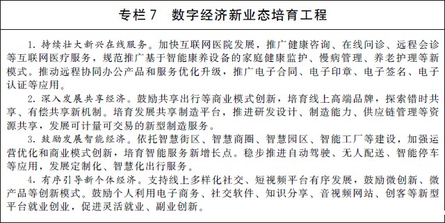 (三)加快培育新业态新模式。推动平台经济健康发展,引导支持平台企业加强数据、产品、内容等资源整合共享,扩大协同办公、互联网医疗等在线服务覆盖面。深化共享经济在生活服务领域的应用,拓展创新、生产、供应链等资源共享新空间。发展基于数字技术的智能经济,加快优化智能化产品和服务运营,培育智慧销售、无人配送、智能制造、反向定制等新增长点。完善多元价值传递和贡献分配体系,有序引导多样化社交、短视频、知识分享等新型就业创业平台发展。