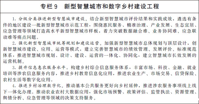 (三)推动数字城乡融合发展。统筹推动新型智慧城市和数字乡村建设,协同优化城乡公共服务。深化新型智慧城市建设,推动城市数据整合共享和业务协同,提升城市综合管理服务能力,完善城市信息模型平台和运行管理服务平台,因地制宜构建数字孪生城市。加快城市智能设施向乡村延伸覆盖,完善农村地区信息化服务供给,推进城乡要素双向自由流动,合理配置公共资源,形成以城带乡、共建共享的数字城乡融合发展格局。构建城乡常住人口动态统计发布机制,利用数字化手段助力提升城乡基本公共服务水平。